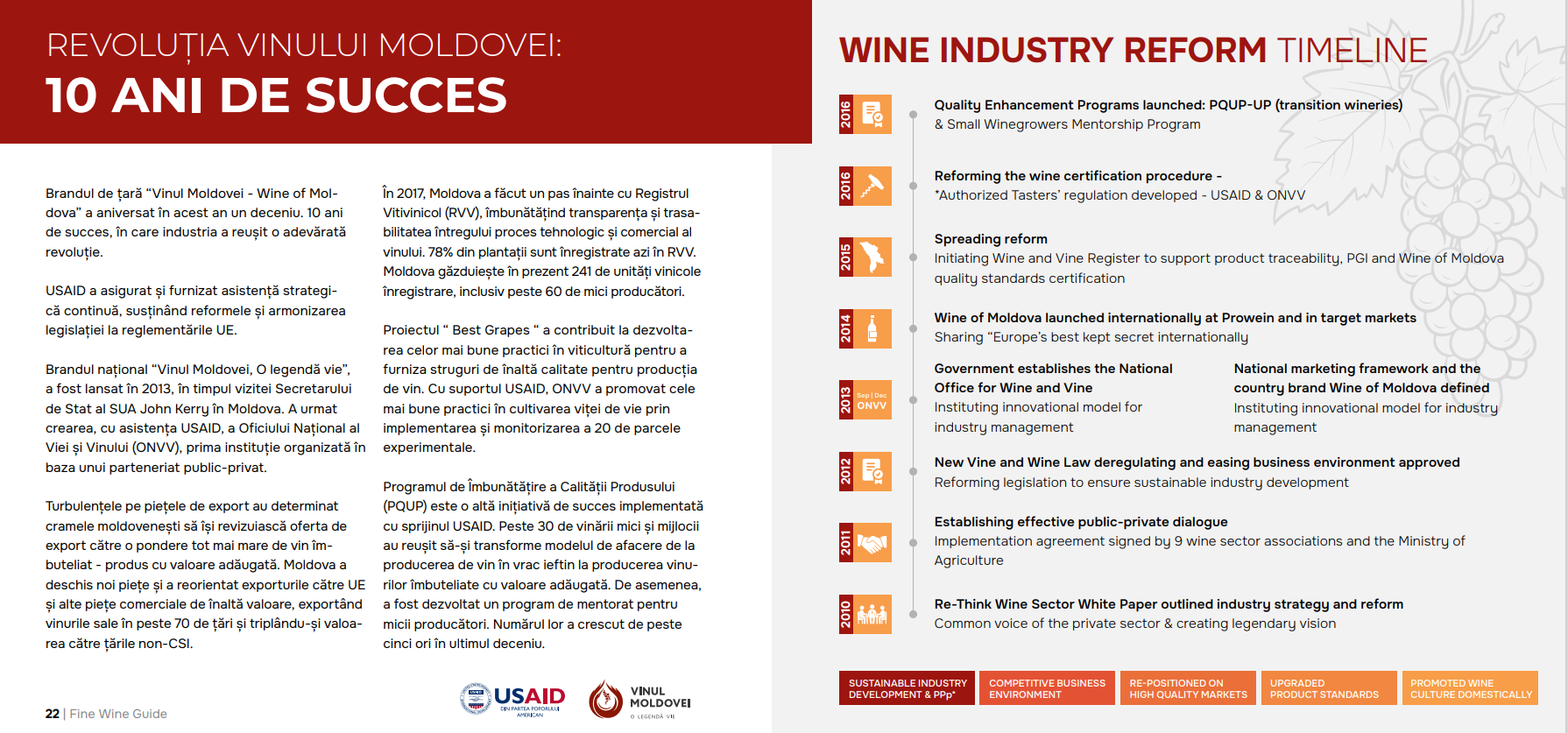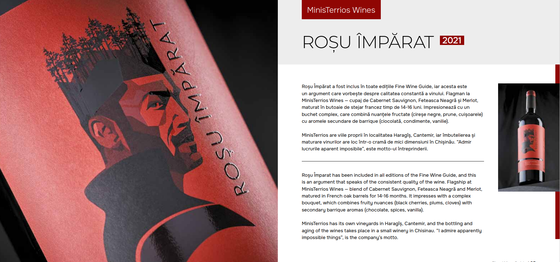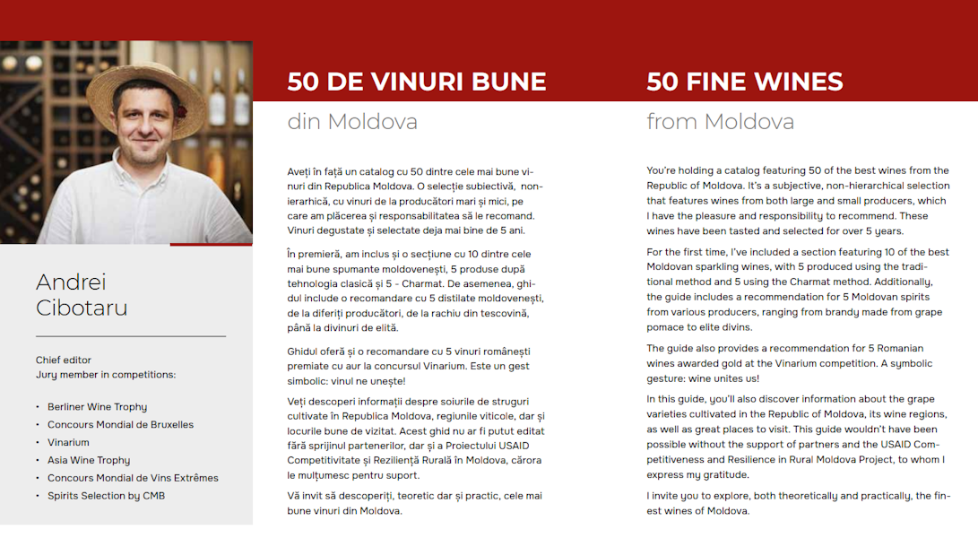 Pela primeira vez, o guia contém uma seção com 10 dos melhores vinhos espumantes da Moldávia, 5 produzido segundo tecnologia clássica, com fermentação secundária em garrafa (champenoise) e 5 - após Tecnologia Charmat (Prosecco). O Guia de Vinhos Finos também contém uma recomendação com 5 Destilados moldavos, de diferentes produtores, desde aguardente de groselha, até divins de elite. Pelo segundo ano consecutivo, 5 vinhos da Roménia, premiados com medalhas no concurso, estão aqui incluídos Vinarium internacional, do qual o autor também é membro do júri. Da mesma forma, o Guia do Vinho Fino descreve as 4 regiões vitivinícolas com indicação geográfica protegida, mas também as principais castas da República da Moldávia. Um capítulo separado é dedicado à "revolução Vinho da Moldávia" nos últimos 10 anos - um esforço conjunto das vinícolas, do National Vine Office e Ao vinho, mas também aos parceiros estratégicos.